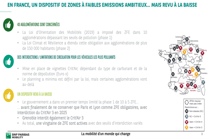 Initialement, 43 agglomérations de plus de 150 000 habitants devaient mettre en place une ZFE avant 2025. Concrètement, 12 ZFE ont été mises en place : à Paris, Lyon, Grenoble, Rouen, Toulouse, Montpellier, Reims, Nice, Marseille, Strasbourg, Saint-Étienne et Rouen.